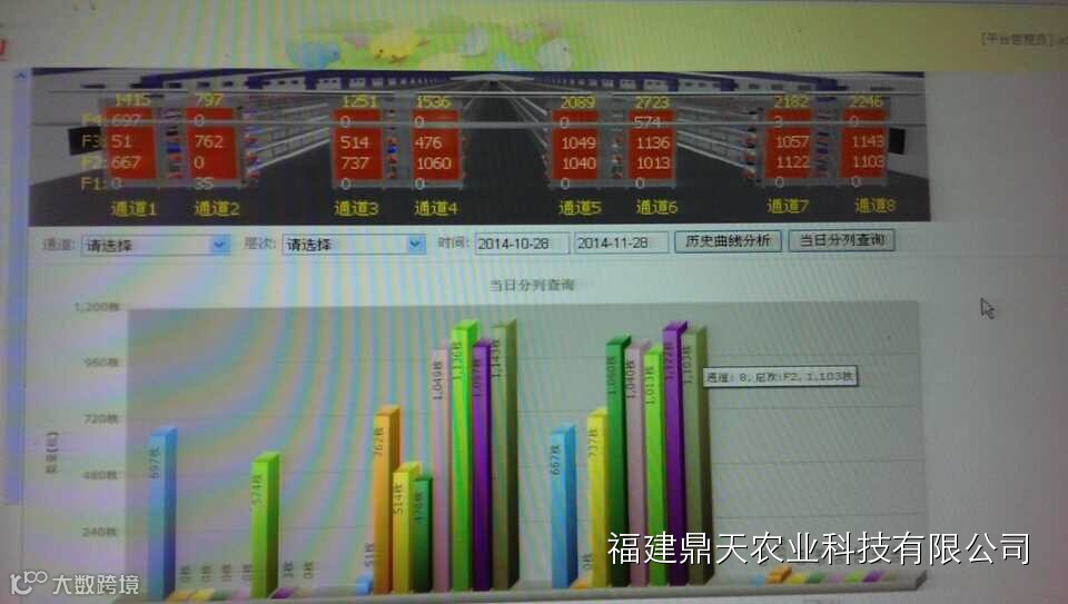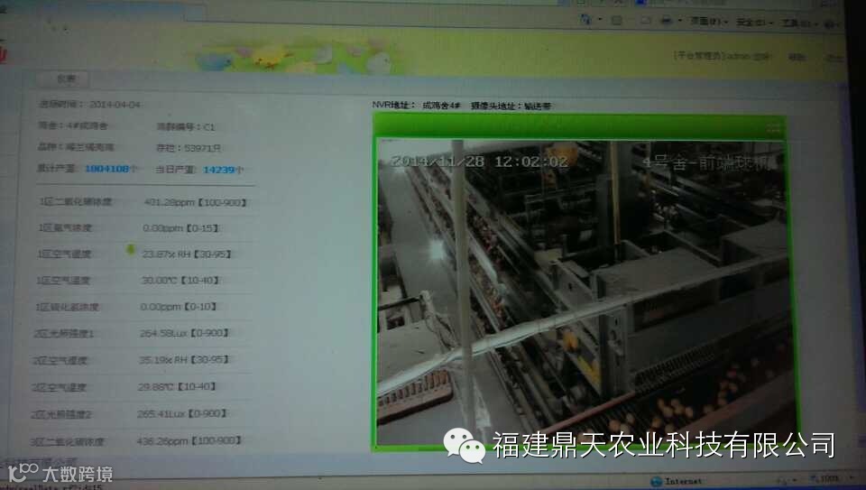 鼎天农科技在鸡舍里安装的一系列相关的传感器,将采集到的数据反馈给蛋禽养殖智能化系统,系统对采集到的环境数据进行比对,自动对环境参数进行调控。 如鸡舍中的空气温湿度高于正常值,系统将自动开启风机、水帘等设备调整温度、湿度至最优;如采集到的硫化氢、氨气、二氧化碳等溶度高于设定的参数,系统将自动开启气窗、风机等设备来降低硫化氢、氨气、二氧化碳等溶度,确保鸡舍内的环境良好。同时系统还将鸡的采食、喂水等数据与产蛋量进行分析,总结经验,拟定最优的生产模型。在良好的生长环境中鸡群的健康情况处于最佳状况,每天下的蛋比原来也多了,这直接提高了鸡场的经济效益。同时物联网还应用于鸡场内的断电报警系统,大大的降低了养殖风险。