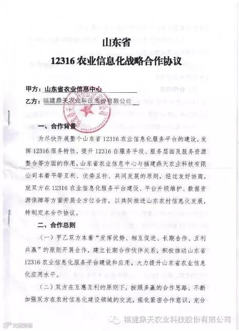 导读: 近日,鼎天农科与山东农业信息中心签署战略合作协议,双方在12316农业信息化服务平台建设、平台维护、