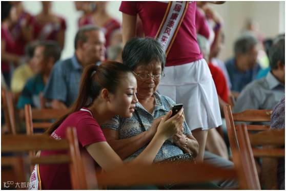 除此之外,康涤风采丽人们还拿出手机,和老人们分享了丰富多彩的校园生活、康涤风采丽人大赛精彩的瞬间,还有参观榄菊集团的精彩花絮;同时丽人们还耐心地教老人们如何拍照、录制视频,如何上微信分享照片,还现场分享了好看、好玩的照片给他们。公公婆婆们仿佛回到了年轻时代,脸上笑开了花。