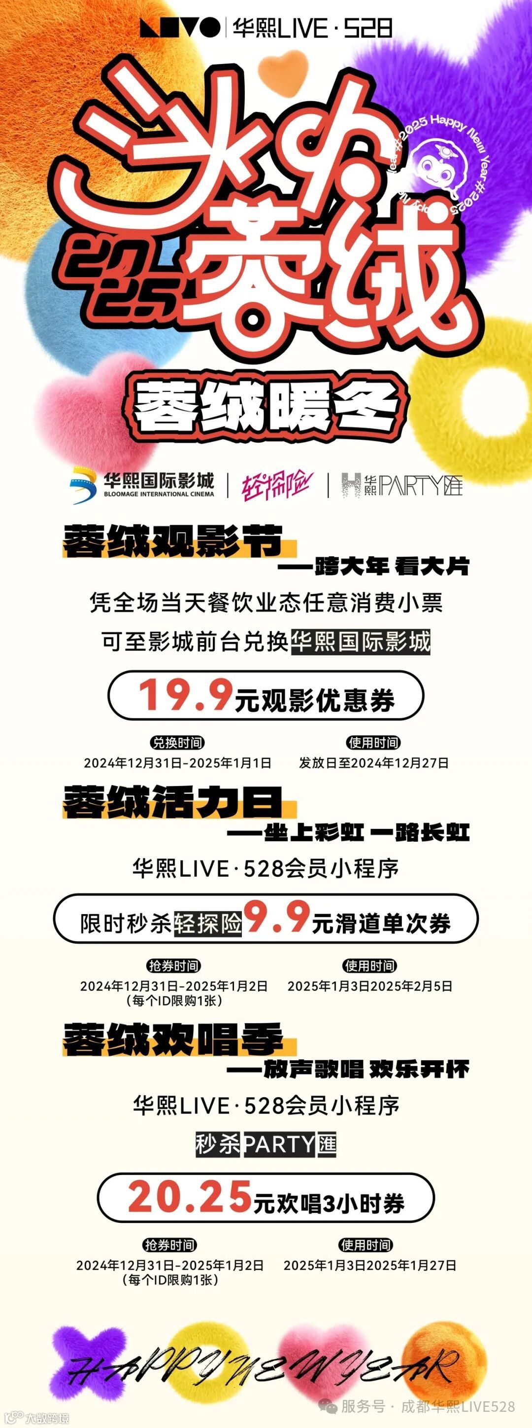 活动内容:联合影城开展【蓉绒观影节】,凭全场当天餐饮业态(大餐、小餐、饮品)任意消费小票可至影城前台兑换华熙国际影城【19.9元观影优惠券】