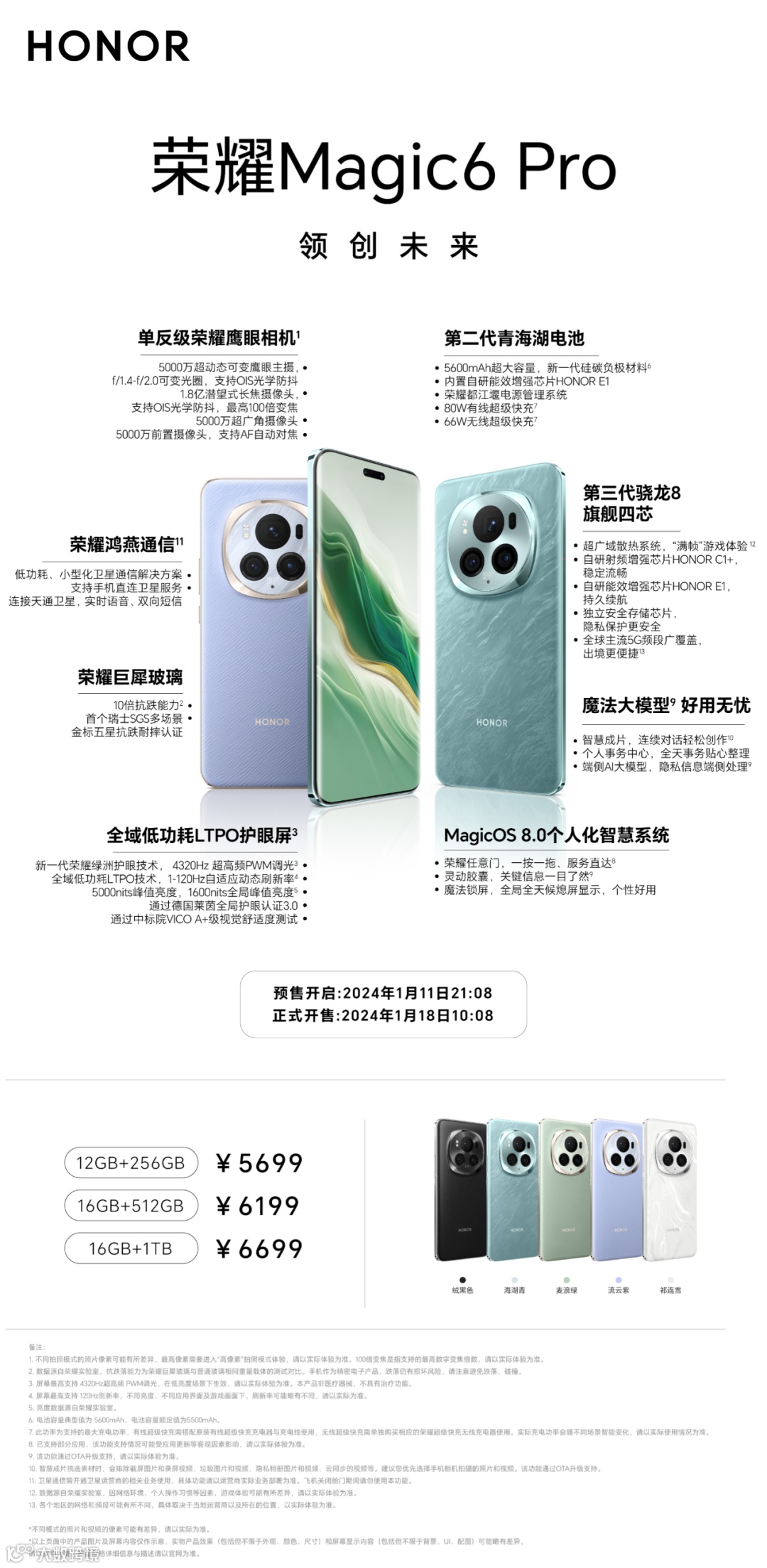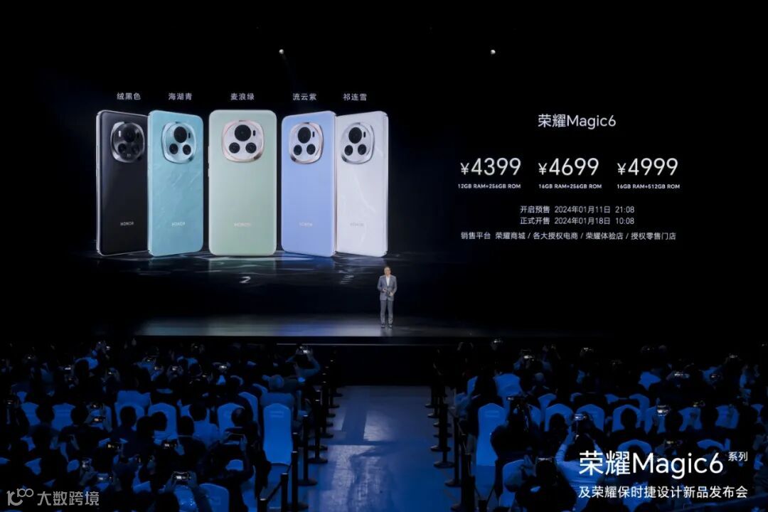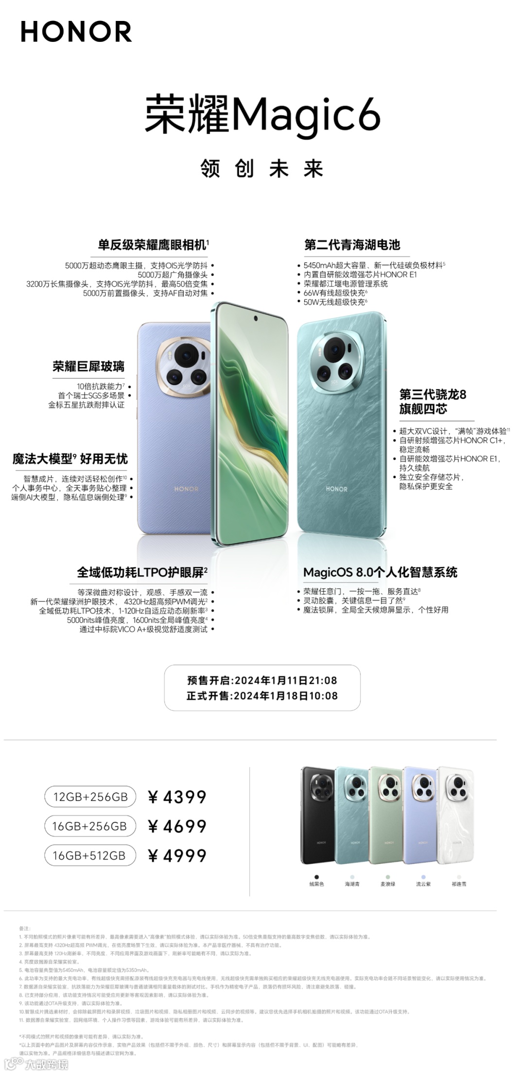 荣耀始终坚持双轮驱动的产品主义,一方面深入洞察用户需求,从消费者需求出发定义产品,另一方面在前瞻技术上加大投入,带来开创性的技术解决方案。此次荣耀Magic6系列,为消费者带来了重构手机直连卫星通信解决方案的荣耀鸿燕通信、全新升级的第二代青海湖电池、超耐摔的荣耀巨犀玻璃、单反级荣耀鹰眼相机、持续引领的荣耀绿洲护眼技术、引领操作系统变革的魔法OS等创新体验。荣耀Magic6系列售价4399元起,将于1月18日正式开售。