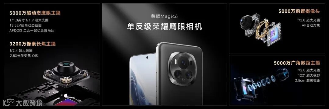 荣耀Magic6系列全面采用定制5000万像素的超动态鹰眼主摄,可以感知明暗,无惧逆光拍摄,带来媲美单反的抓拍体验,定义旗舰抓拍新标准;其中荣耀Magic6 Pro更是采用目前业界领先F1.4超大可变光圈,支持F1.4-F2.0智能可变光圈;同时配备1/1.49英寸业界领先大底长焦传感器、1.8亿像素的潜望长焦,轻松聚焦更多光线,达成更为清晰的影像拍摄。荣耀Magic6Pro超强的单反级荣耀鹰眼相机,实现了更进一步的全焦段鹰眼抓拍,给你单反级质感人像、单反级运动抓拍、单反级风光摄影以及单反级十八箭星芒,满足更多场景下轻松记录精彩瞬间的需求。