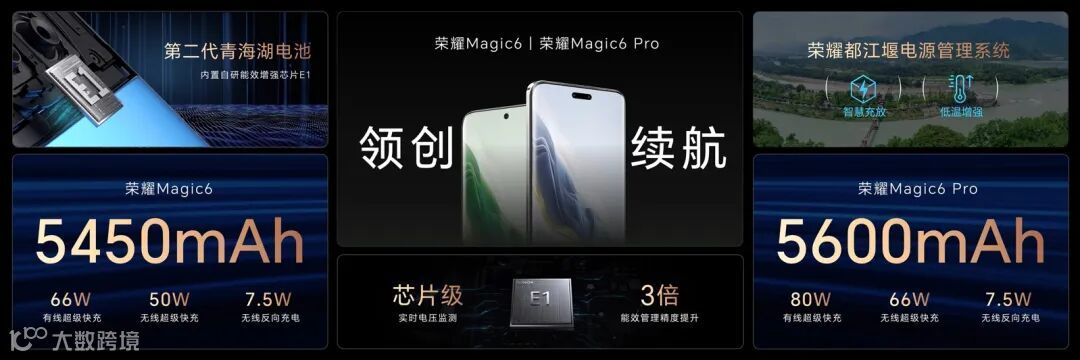 荣耀Magic6系列搭载全新升级的第二代青海湖电池,内置了全新的自研能效增强芯片HONOR E1,配合荣耀都江堰电源管理系统,通过软硬结合,实现了智慧充放和低温增强,为消费者带来全场景全天候长续航体验 。