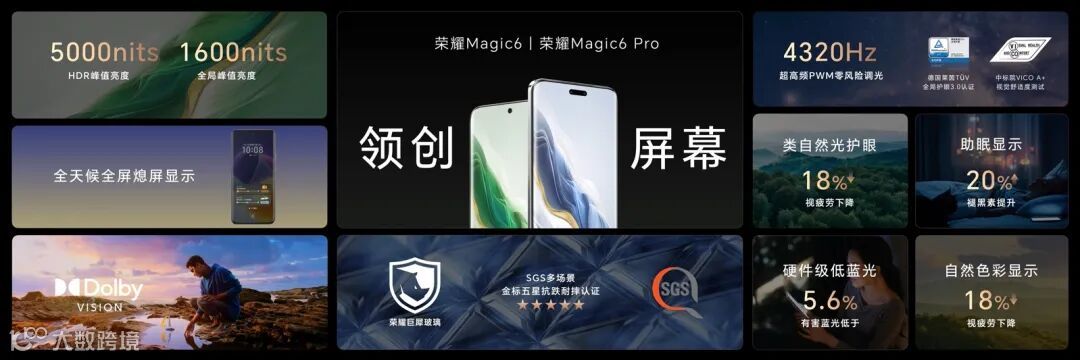 作为护眼技术的持续引领者,荣耀Magic6系列支持五大绿洲护眼技术,行业领先的4320Hz超高频PWM调光、类自然光护眼、助眠显示、硬件级低蓝光、自然色彩显示,并通过德国莱茵TÜV全局护眼3.0认证和中标院VICO A+视觉舒适度测试。