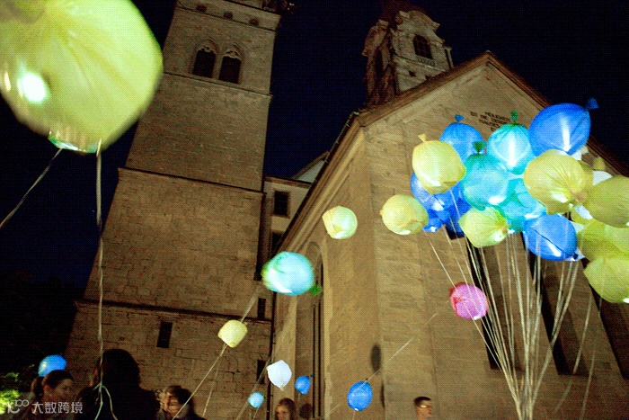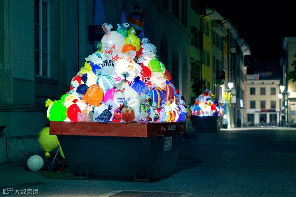 在 Gewerbemuseum 美术馆《哦,塑料袋!》(Oh, Plastiksack!)展览开幕的当天,Luzinterruptus 更将作品中未使用的塑料袋制作成漂浮的发光气球,把它们送给当地居民作为礼物。那一晚,无数的回收塑料袋如点点星光,在温特图尔的夜空中闪烁。那是环保的光,也是对自然的爱。