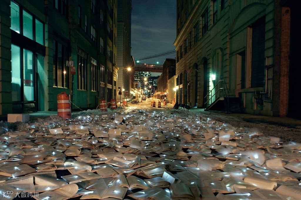 比如,2010年,Luzinterruptus 在纽约进行了公共艺术干预项目《文学对战交通》(Literatura Versus Tráfico)。他们用几千本书和小灯泡覆盖了纽约市的一条街道,从字面意义上用“文学”阻碍了车辆的通行。这个影响交通的项目只持续了7个小时,但却让 Luzinterruptus 名声大噪。此后他们又受邀在墨尔本冬日艺术节和多伦多白夜艺术节等多场艺术活动中复刻了这件作品。