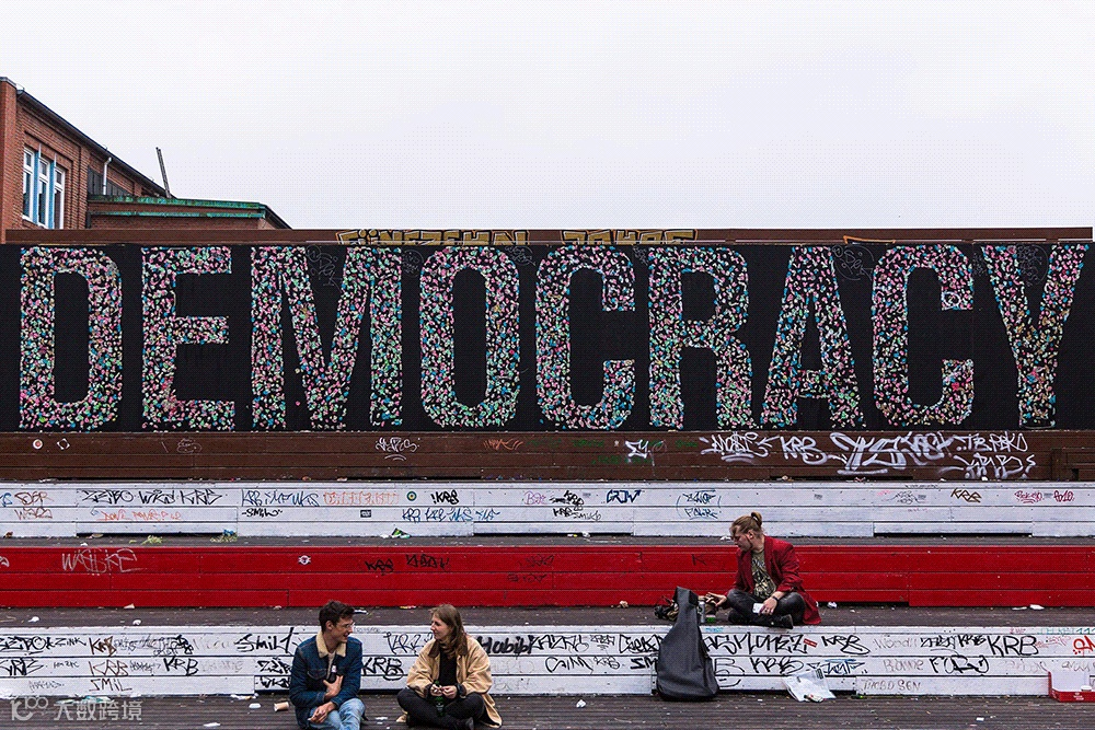 比如,他在德国汉堡市邀请了几千个居民,让他们把口香糖粘在墙上,拼出“DEMOCRACY”的字样。所谓“DEMOCRACY”就是一人吐一块口香糖?这很难说不是一种对现状的质疑与讽刺。