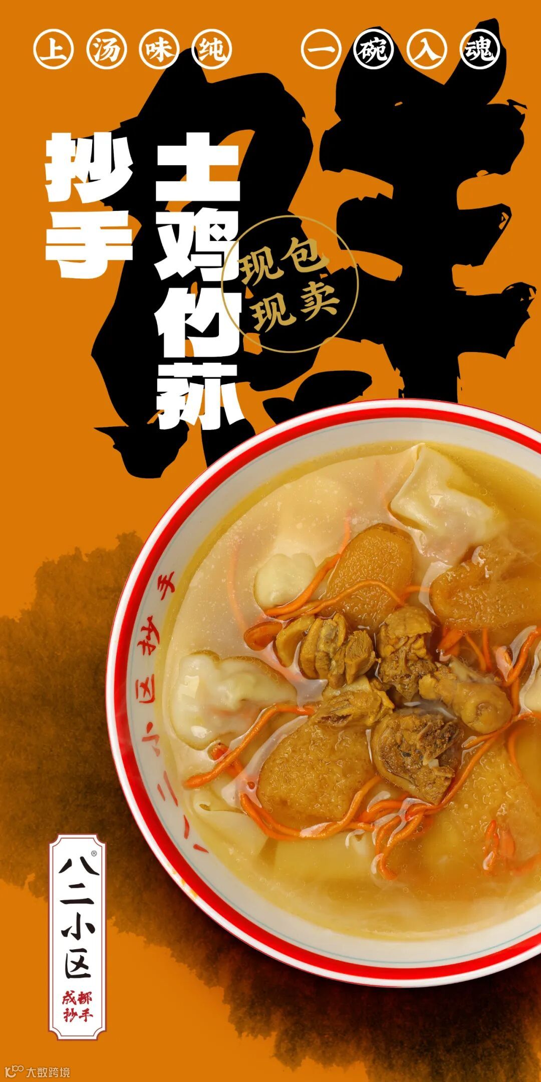 土鸡竹荪抄手:跑山鸡选用剑阁跑山鸡,每日文火现熬靓汤,辅以风干竹荪,鲜香难忘营养丰富。