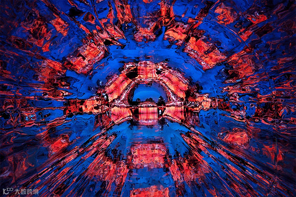 感官的边界虚无却又真实,Rejane Cantoni呈现了一个由各种数字感官构建的生态系统,参观者在其中体验数据的环境变化,并在不断变化的“万花筒隧道”中与彼此互动,远眺成都城市天际线。