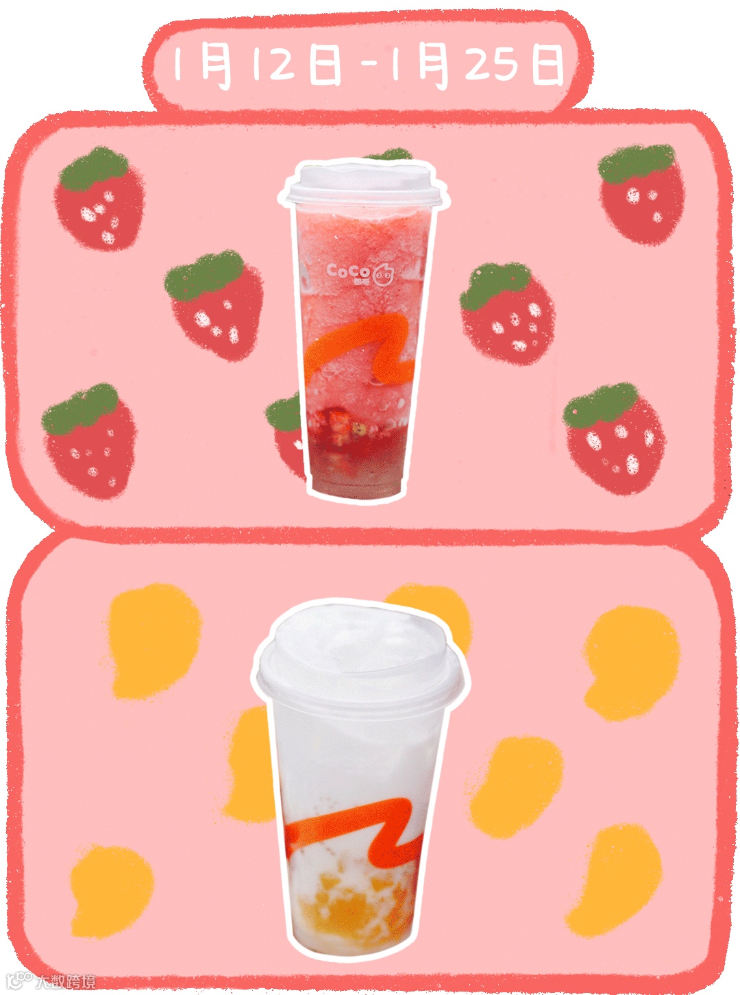 @全成都人,1月12日-1月25日,全成都的CoCo奶茶草莓甜心特价12元,杨枝甘露轻盈版特价6元,新年记得做个快乐的CoCo肥仔