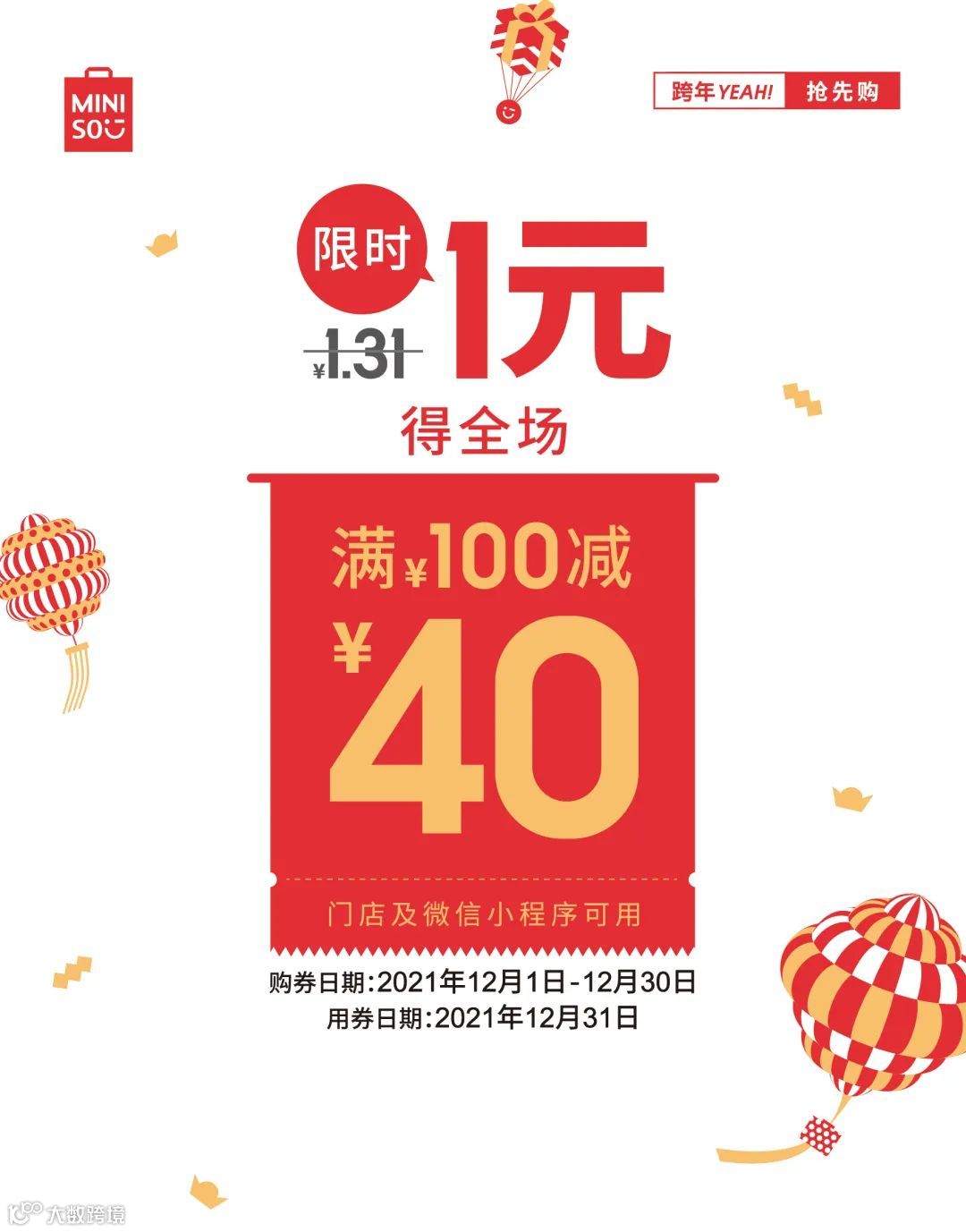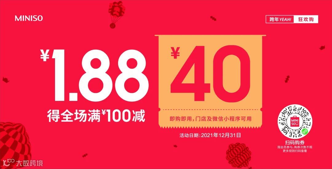 (100减40元优惠券,名创优品全国门店、名创优品小程序各一张;