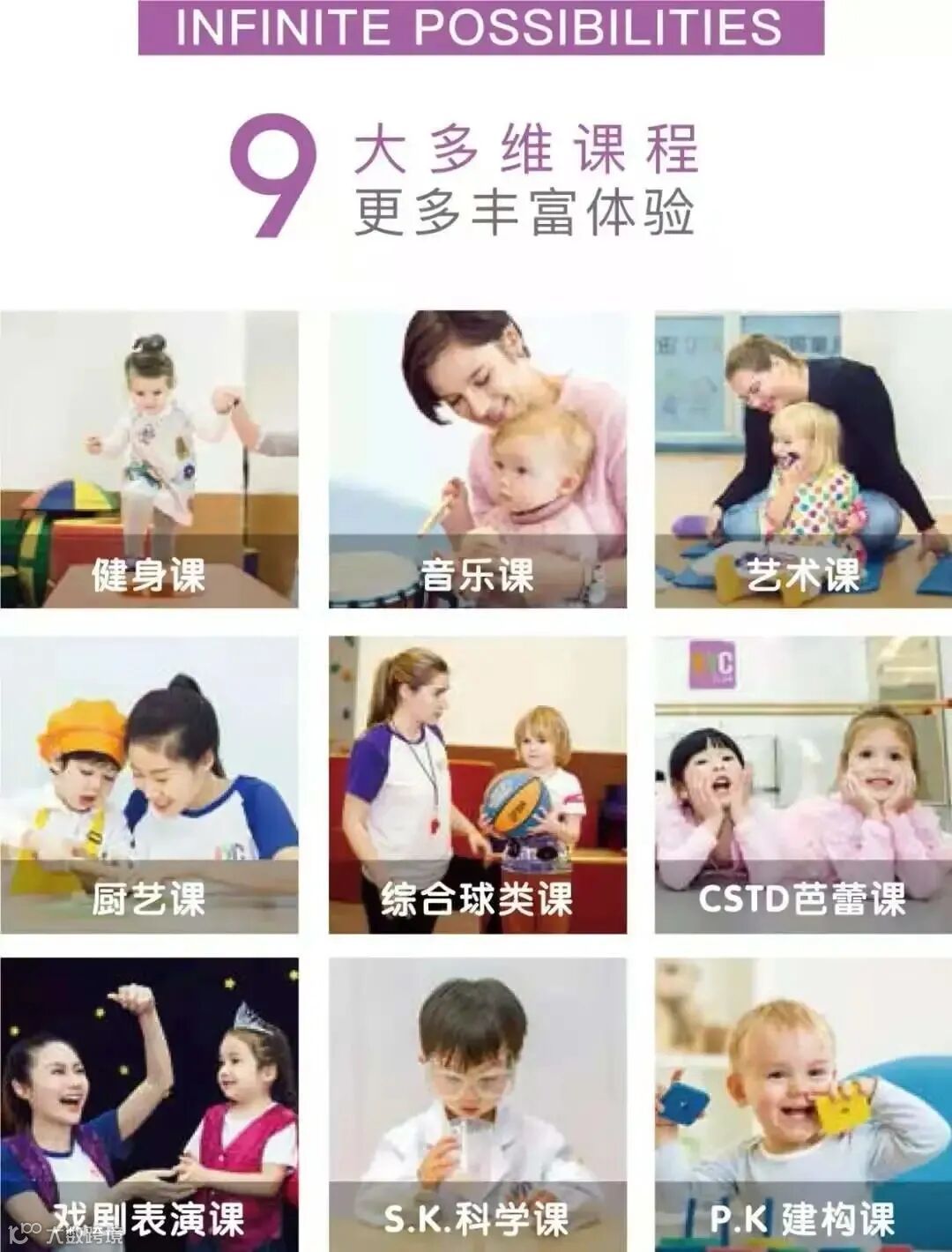品牌以多元智能教育理论为基础,主打八大课程,含健身课、音乐课、艺术课,球类运动课,厨艺课,以及特色的芭蕾舞课、街舞课和戏剧表演课,课程种类丰富、综合,体系设置科学、系统,动静结合。经过多年的潜心积累与沉淀,不断升级和改造,打造品质早期教育品牌。
