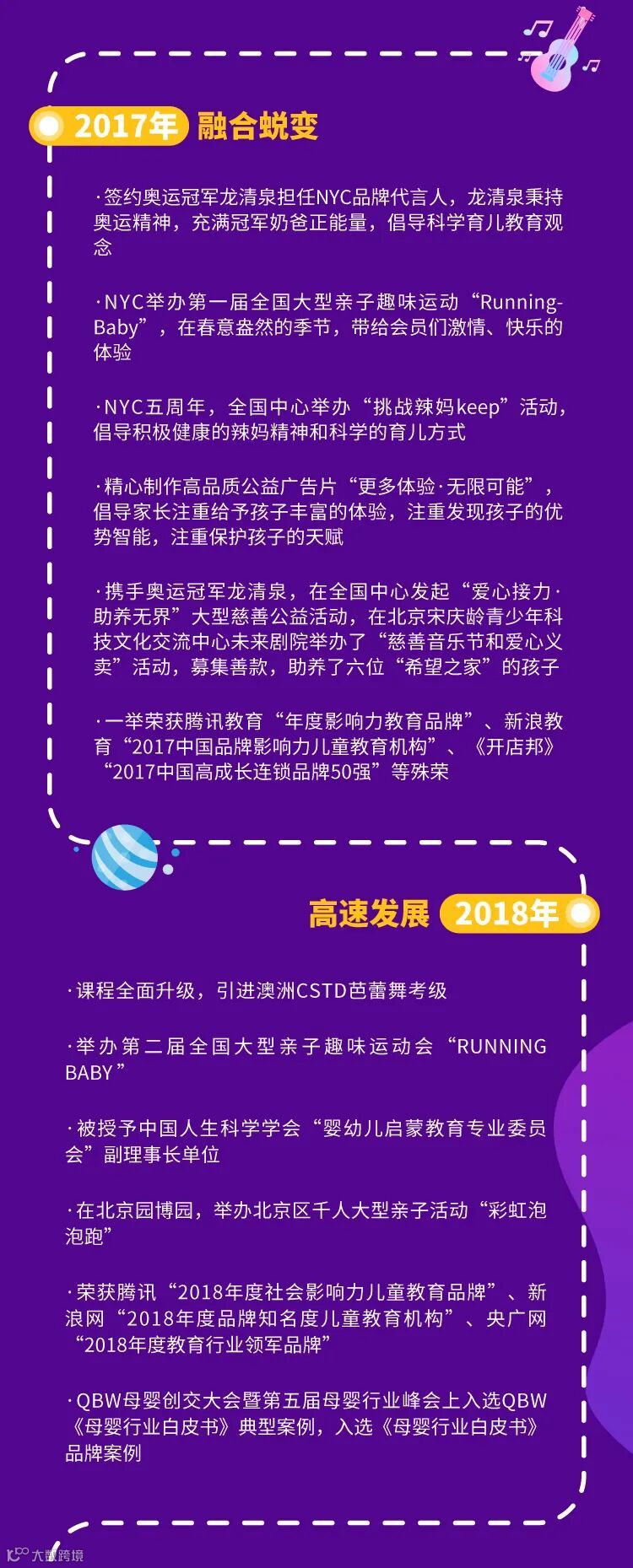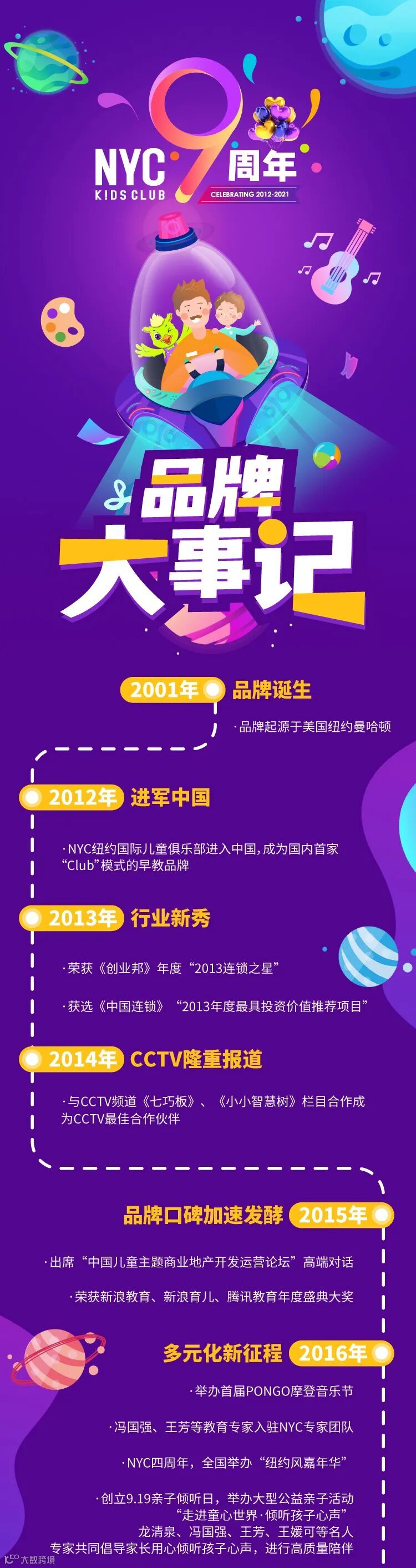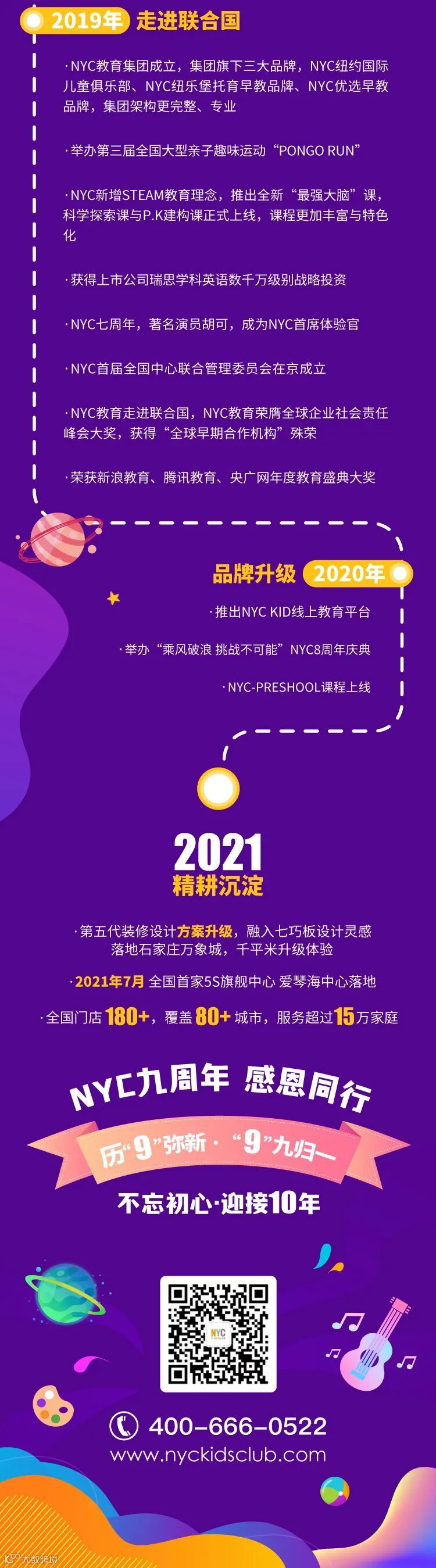 NYC纽约国际儿童俱乐部起源于美国纽约,是服务于0—3岁孩子家庭的国际早期教育品牌,致力于为家庭创造多元化教育生态环境。2012年成立中国区总部,成立中国区第一家分中心。NYC纽约国际是美国幼儿教育协会(NAEYC)的权威认证机构,拥有科学、完善的早期教育课程体系,并首次将儿童俱乐部概念和多元化智能教育概念引入中国的早期教育行业。从2013年开始在全国发展的模式布局全国战略,截止至今,共计全国中心130多家。