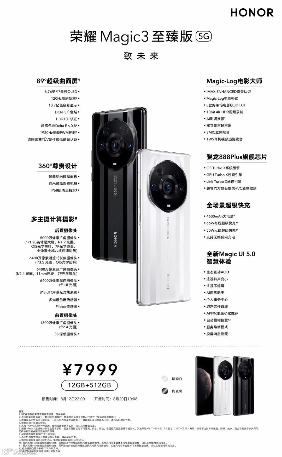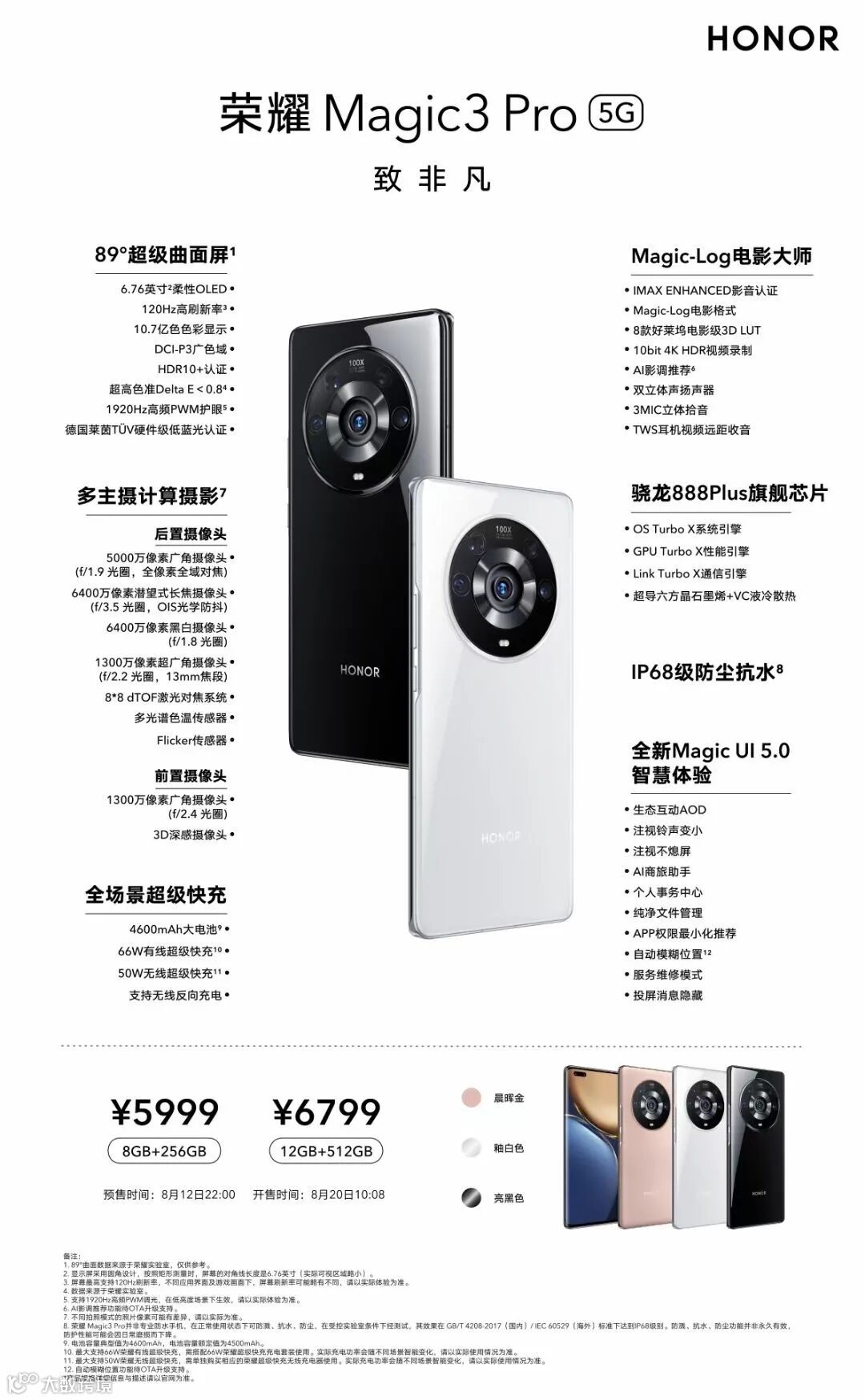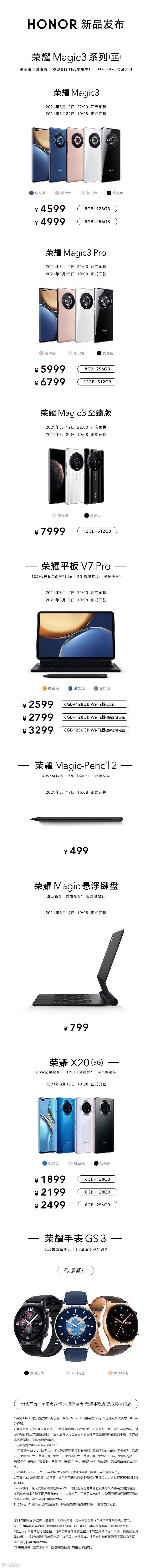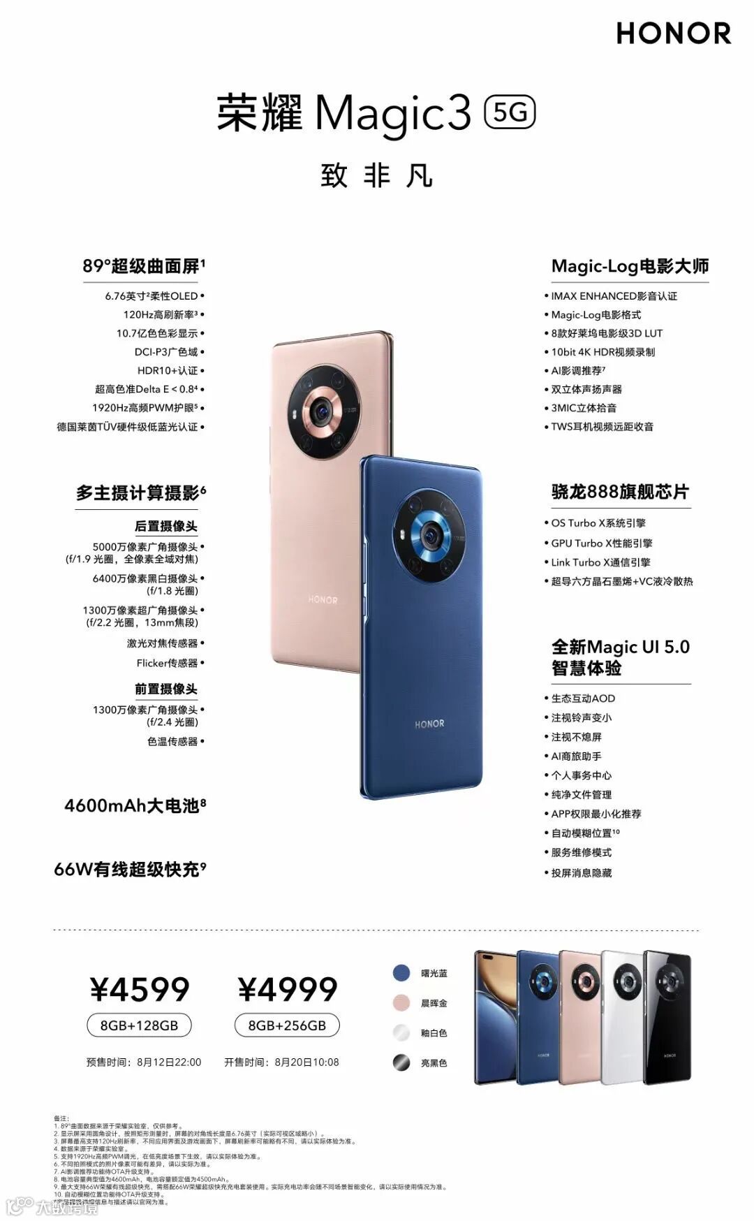 售价方面,荣耀Magic3 8GB+128GB版、8GB+256GB版价格分别为4599元、4999元。荣耀Magic3 Pro 8GB+256GB版、12GB+512GB版价格分别为5999元、6799元。荣耀Magic3 至臻版12GB+512GB价格为7999元。