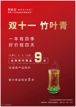 恰逢一年一度的“双十一”,来竹叶青线下门店享受优惠好价,自饮品质上佳,送礼备有面子,与亲朋好友合作伙伴,共饮一杯健康世博茶。