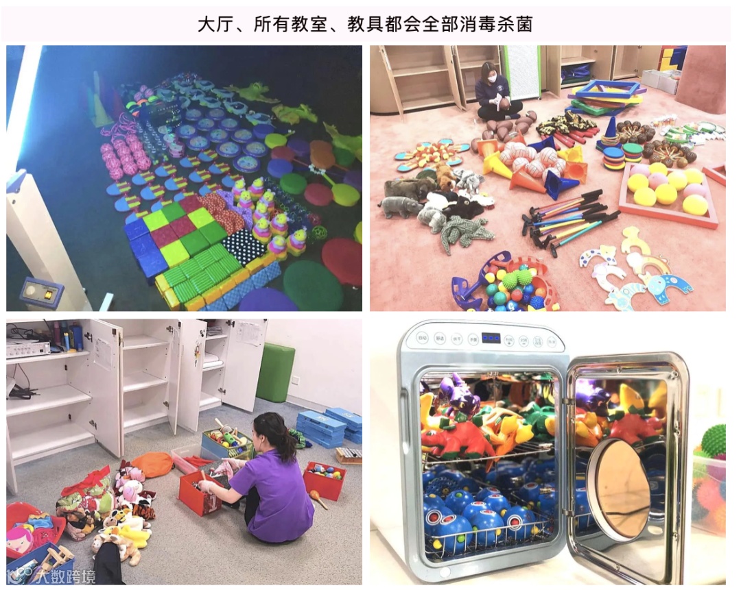 为确保NYC各中心所有教具的干净、卫生,针对不同规格、不同材质的各类教具制定了不同的消毒方法。工作人员需在每天及每周使用专业的清洁用品对各类教具进行清洁、消毒及养护,在进行基础清洁后,还需要接受臭氧和紫外线的再次消毒,以确保消毒工作更加彻底。