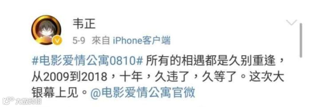 2018年5月9日,《爱情公寓》导演韦正发表一条微博:“电影爱情公寓0810 所有的相遇都是久别重逢,从2009到2018,十年,久违了,久等了。这次大荧幕上见。”一石激起千层浪,许多《爱情公寓》的铁粉们纷纷表示期待已久。
