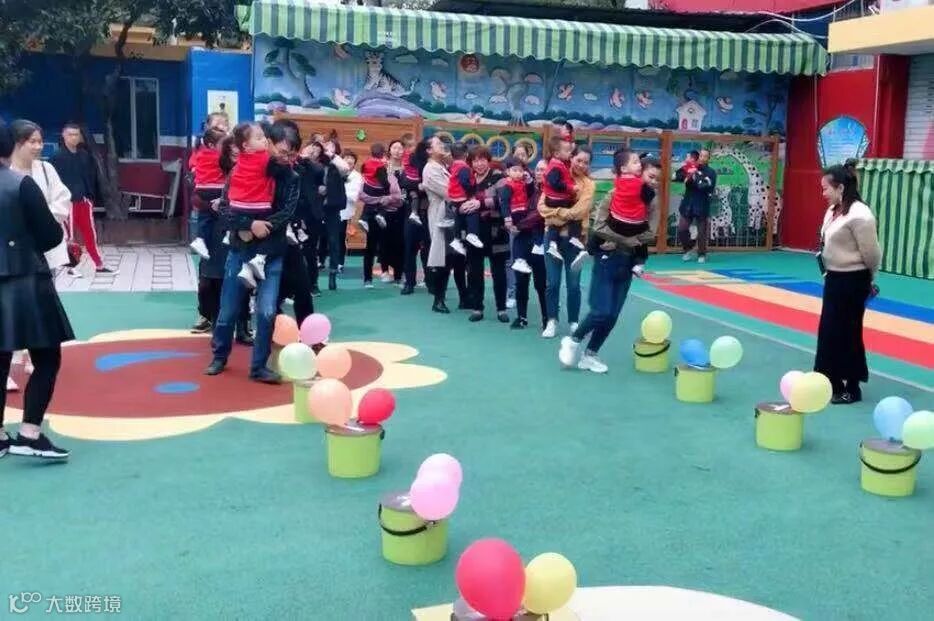 家长们需要身穿粘球衣,从起点走过指压板到达终点