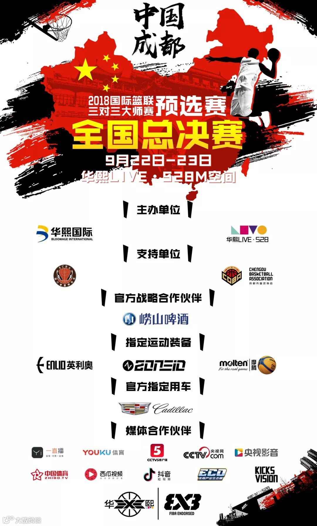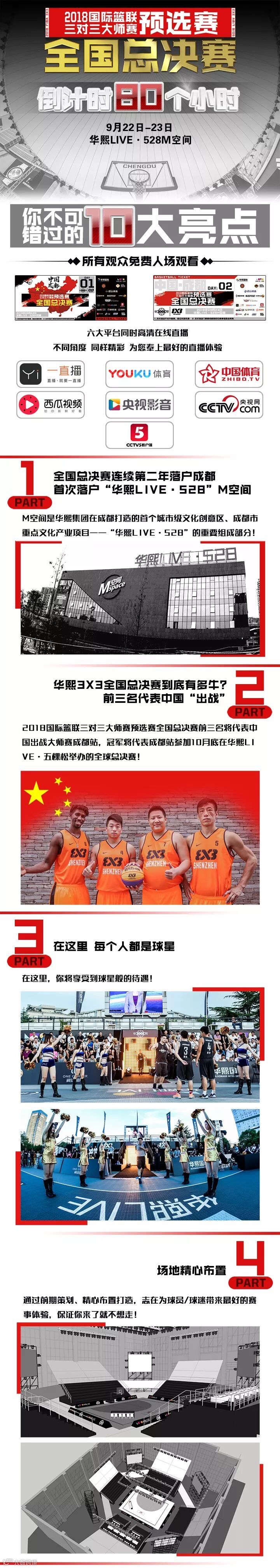 2018国际篮联三对三大师赛预选赛全国总决赛(华熙3X3)将于本周末(9月22-23日)在成都“华熙LIVE·528”震撼开战,为期2天、15个小时、16支球队、64名球员、32场激烈对决将如期上演。