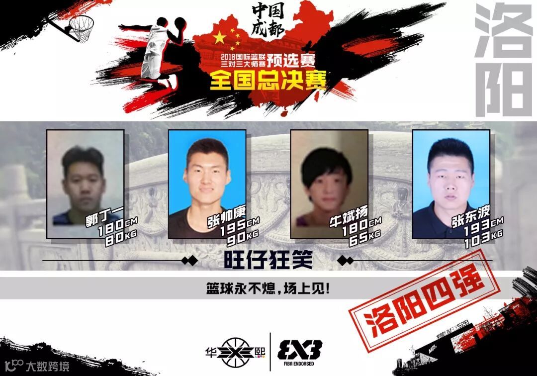 来自洛阳的旺仔狂笑队由郭丁一、张帅康、牛斌扬、张东波组成,其中牛斌扬是球队的绝对核心,他拥有娴熟的运球以及出色的传导球能力。