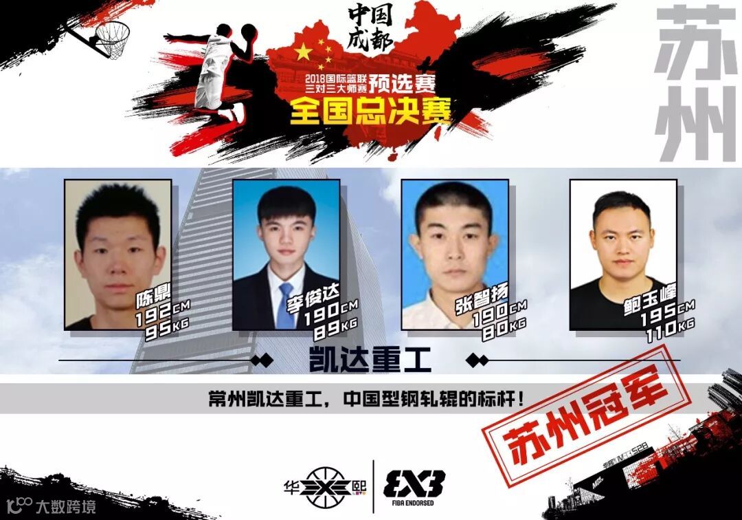 来自苏州预选赛的凯达重工队由陈鼎、李俊达、张智扬、鲍玉峰组成。作为本次全国总决赛中FIBA官网排名数一数二的球队,他们的阵容配备十分合理,均有着出色的个人能力。