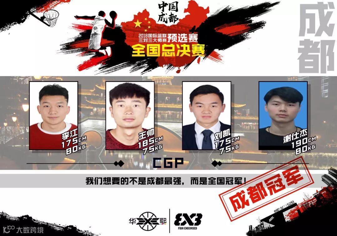 来自成都的CGP队的由李江、王帅、刘凯、谢仕杰组成。他们在成都预选赛中表现十分出色,凭借出色的外线手感拿下“成都最强”的称号。