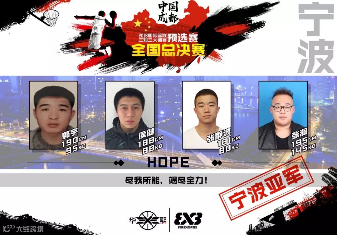 来自宁波的HOPE队由郭宇、侯健、张静波、张瀚组成。他们的阵容配备十分合理,有着郭宇、侯健为球队攻城拔寨,还有着内线“巨无霸”张瀚为球队保驾护航。