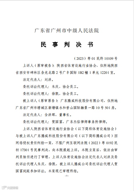 为维护自身合法权益,我司对陕西省体育设施行业协会提起了诉讼。经过1年多的法院一审、二审工作,依据查明的事实,法院认定:陕西省体育设施行业协会在微信公众号发布的红头文件,确已对腾威公司名誉造成