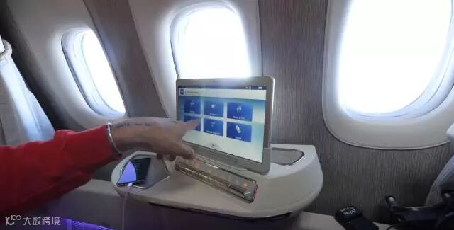 和普通头等舱不同,包厢有2台电视,一台是座位前面的高清液晶电视,无线遥控,用来躺着看电影,完美