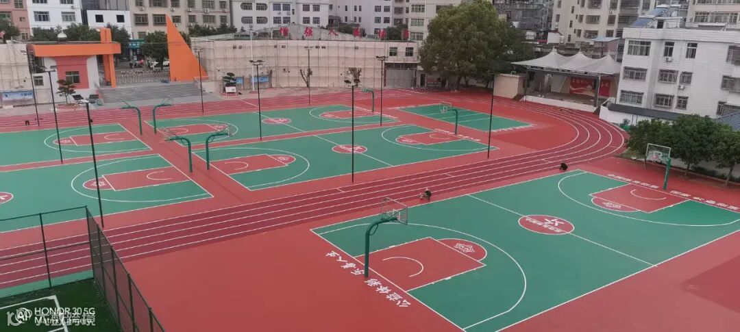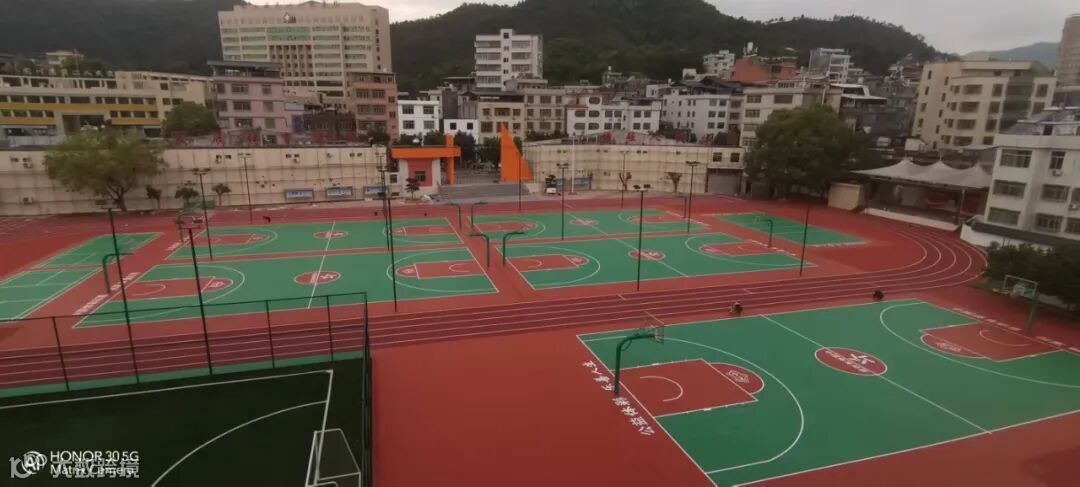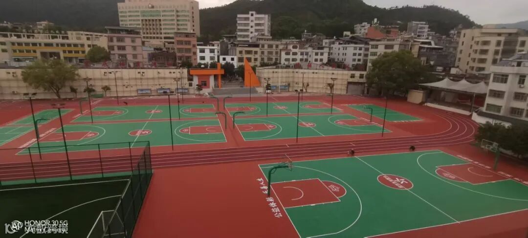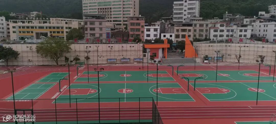河源市麻布岗中学6000平方户外操场/球场采用广东腾威科技股份有限公司生产的水性硅PU球场材料,设计厚度为新国标8mm厚度,使用材料80余吨。该项目得到了中国体育彩票基金的大力支持。