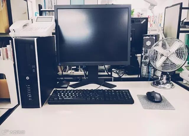 办公桌,除了电脑、小风扇,没有其他杂物。