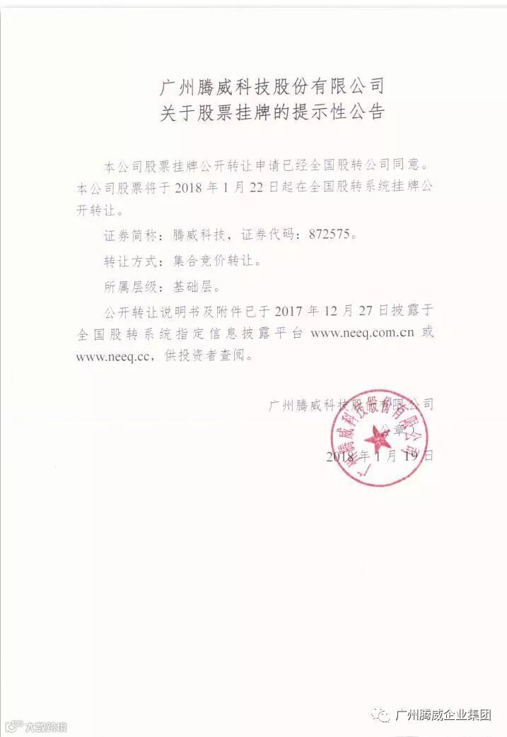 广州腾威科技股份有限公司股票挂牌公开转让申请已经全国股转公司同意。