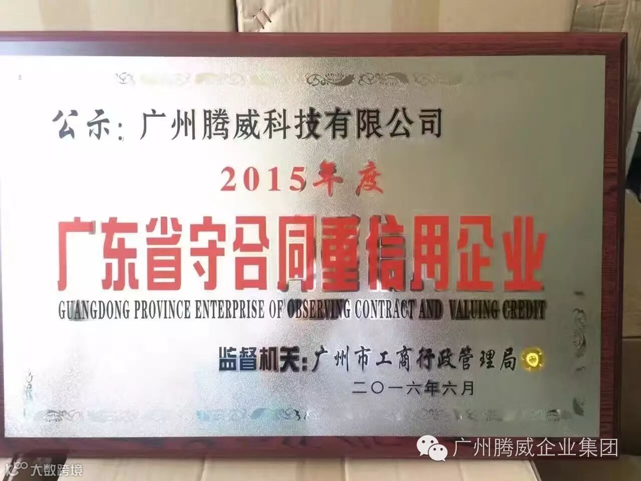 2016年6月18日,获广州市工商局授牌“广东省重合同守信用单位”称号: