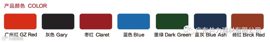 多种颜色,分别为广州红、灰色、枣红、蓝色、墨绿、兰灰、砖红。
