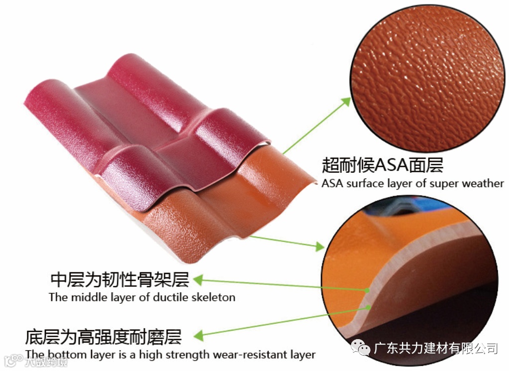 ASA合成树脂瓦采用先进的三层共挤(A/B/C)技术,表面材料A层:耐候性树脂;中间材料C层:PVC材质;底层材料B层:次耐候层和白色韧性耐磨材料,一次加工而成。
