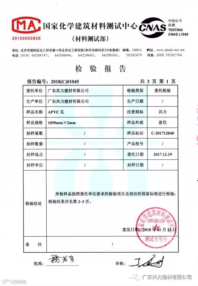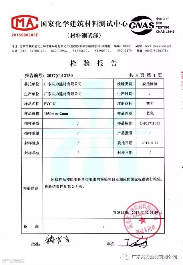 共力一直追求产品质量保证,共力PVC瓦采用德国巴斯夫进囗颜粉,比普通国产颜粉色彩保持更好;共力PVC瓦均为经国家化学建筑材料测试中心检测合格的产品。