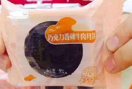 外皮是巧克力,馅是香辣牛肉,被指是外焦里嫩的逆转版。据称,十年前,一位女生在机场对男友说:我和你是不可能的,就像巧克力和牛肉不可能在一起一样。十年后,一位点心师面对着巧克力香辣牛肉月饼的生产线,泪流满面。