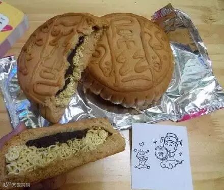 独家制作,上好的面皮夹着香气扑鼻的红烧牛肉方便面,这画面太美我不敢看实在是想不出是谁发明的这么清新脱俗的方便面月饼,能把月饼蒸熟而保证方便面的酥脆恐怕也是一门绝活吧?牙口不好的慎买。