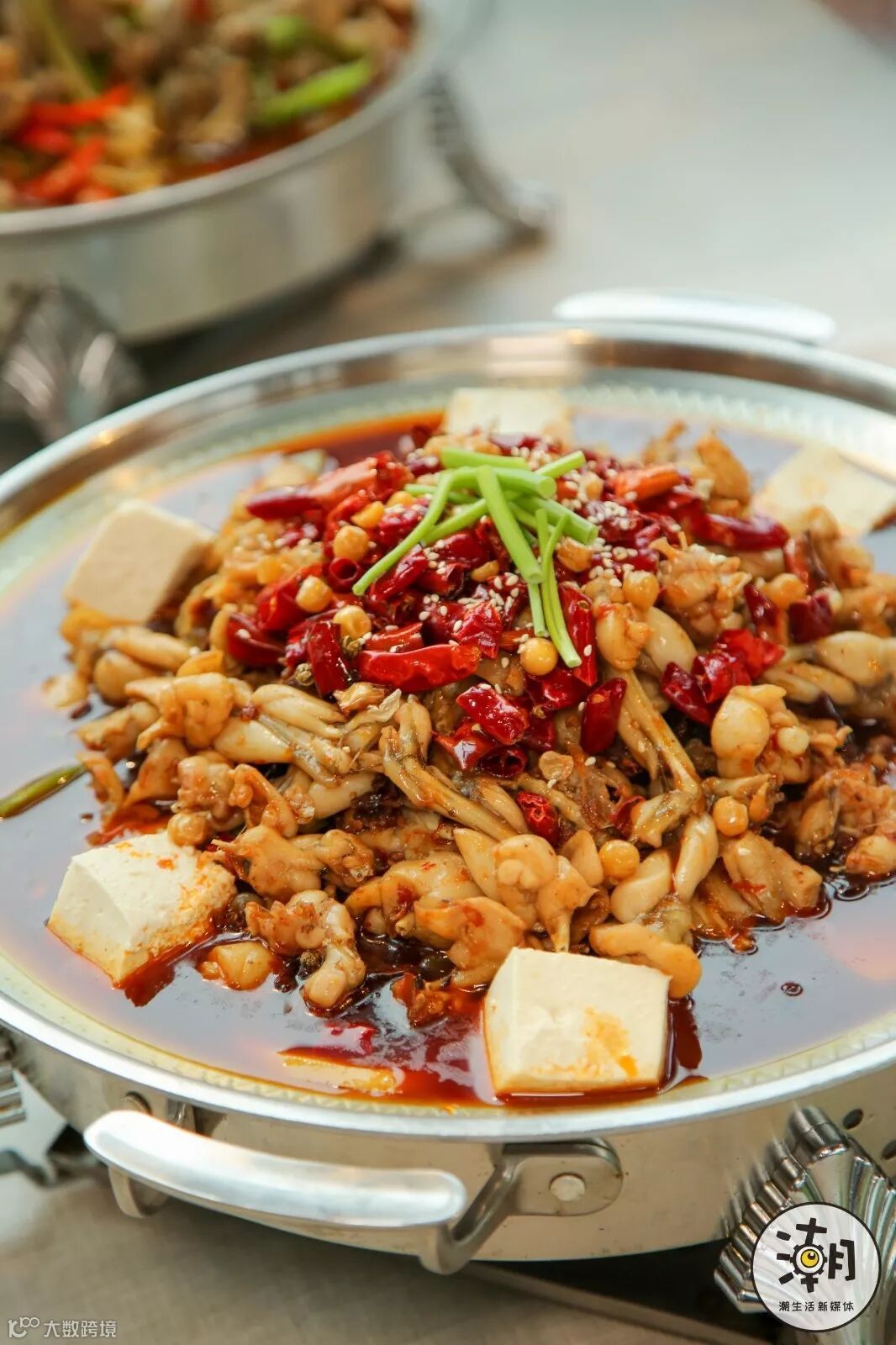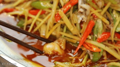 牛蛙和豆花在麻辣汤底里一直热着翻滚着
