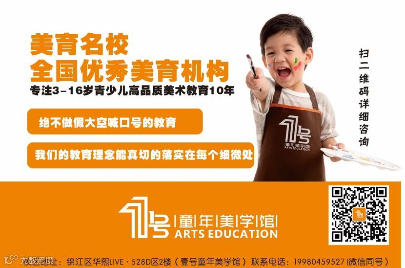 壹号童年美学馆是壹号童年教育集团旗下重点品牌,创立于2009年,自创立开始就一直致力于3-16岁青少儿美育。是行业内为数不多的专业级美育机构;区别于市面上鱼龙混杂的培训机构,真正做到了将教育理念落实到每一个细微之处。目前在成都已经开设11家直营校区、壹号童年有自己的使命“提升孩子未来的核心竞争力,用美育提升孩子的幸福感”。依据自身10年来一线教学实践经验,拥有一套科学的学员成长体系,并率先引进全球优质的“大美·美育课程”和原版“美国艺术教育课程” 。