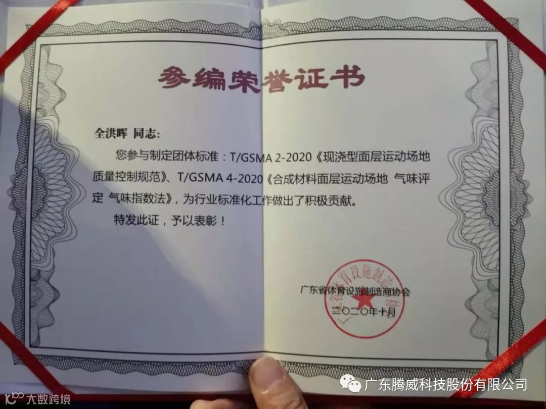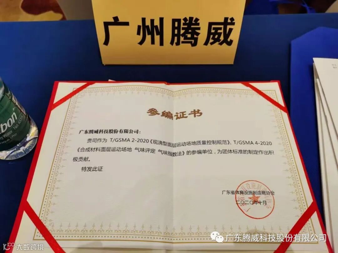 广东腾威科技股份有限公司作为体育地材业界高新技术企业领跑者,一直以来聚焦于中国体育行业发展现状和存在问题,积极参与行业相关标准制定,全力推动运动场地行业健康良性发展。一年多来,腾威科技和业内优秀同行一起成立攻关组,通过实物比对研究、提出提升措施,制定质量控制规范,致力于通过全链条质量管理控制规范的团体标准,为运动场地行业以及使用终端提供解决方案,为运动场地的建设管理水平带来促进作用。