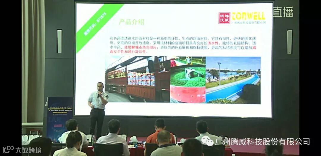 赛场上,广州腾威科技股份有限公司董事长全洪晖先生展示了公司研发生产的新型复合材料“彩色高渗透透水路面材料”,该材料主要用于铺装海锦城市透水路面,城市绿道、校园跑道等各方面的建设。全董从产品优势、市场前景、落地项目、以及团队优势等方面逐一介绍了彩色高渗透透水路面材料的优势。该产品相比市场上同类产品具有更好的透水效果、更好的耐候性、耐磨性,更高的强度以及更好的铺装操作性、和易于保养。采用该材料将实现良好的透水性,以缓解城市热岛效应。此外,具备更高的粘结强度,增加路面安全性和通行舒适性。在现场的答辩环节,广州腾威科技股份有限公司代表向评委展示了广州生物岛项目十公里环岛蓝色绿道采用腾威公司新型复合透水路面胶粘剂所取得的实际应用效果,并以自信、热情的心情与评委专家组进行了充分的交流,赢得现场评委对该项目的一致看好。
