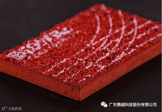 腾威公司生产的跑道面层S-9为无溶剂聚氨酯弹性耐候面胶,专用于体育跑道及弹性健身步道的铺装。双组分跑道面层S-9甲组(也叫面层甲组,面甲)为MDI和聚醚多元醇的无溶剂预聚体,S-9乙组分为聚醚多元醇、耐候树脂、环保氯化石蜡、交联树脂、色浆等组成的无溶剂混合浆料。甲乙组按比例混合后发生凝胶反应,生成聚氨酯跑道面胶,该面胶弹性好、强度高、附着力高、耐候性好、保色好、耐磨、不返油、无异味。