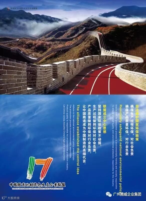 广州腾威作为绿色生产企业联盟发起单位之一,承诺始终遵循联盟宗旨:规范体育地面运动地材研发和生产的绿色健康发展,确保生产企业生产过程中不对环境造成污染,确保产品符合最新国家标准。执行国家环保法,做良心企业,做环保产品,为“美丽中国、健康中国”身体力行!
