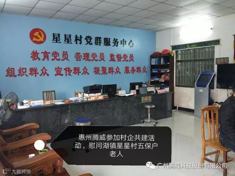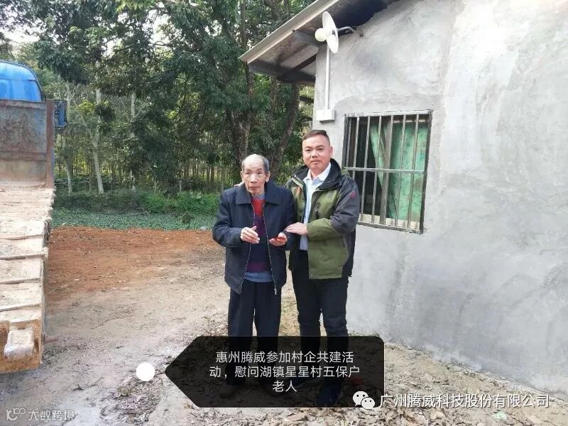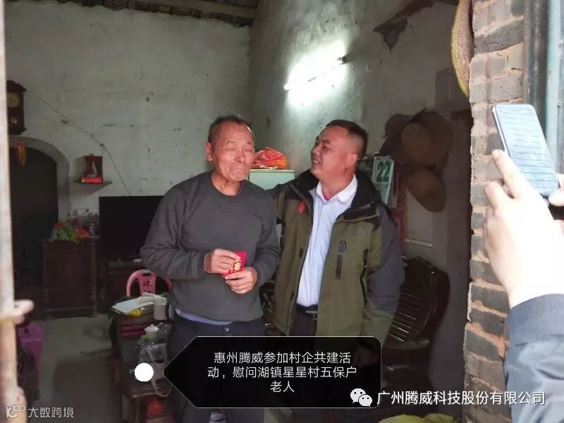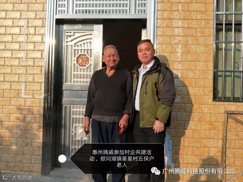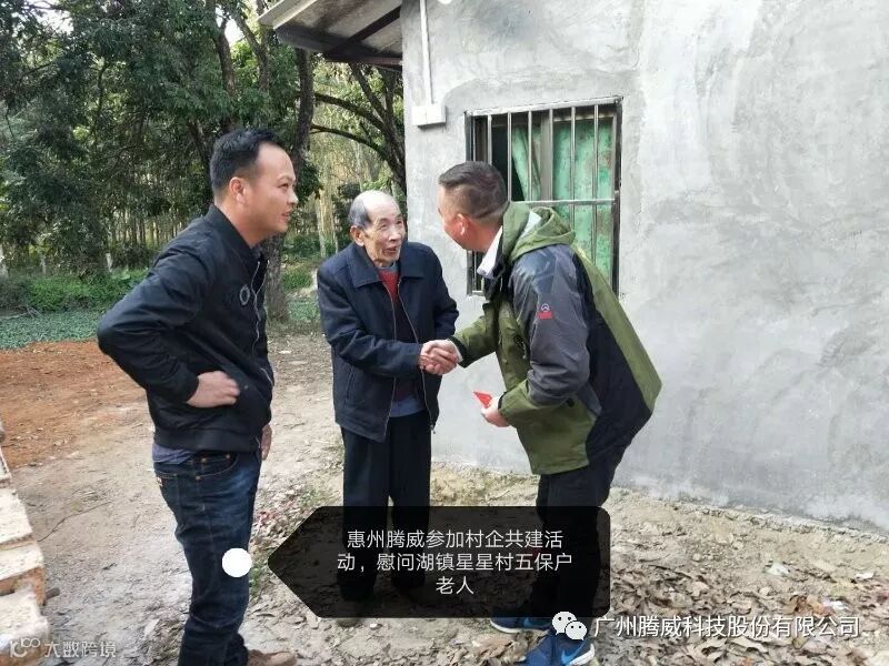 2019年1月22日,在惠州市博罗县政府的号召下、在湖镇镇领导牵头组织下,腾威股份全资子公司惠州市腾威新材料有限公司联合湖镇镇星星村村委开展村企共建活动,惠州市腾威新材料有限公司负责人全红旭先生代表腾威慰问了星星村11户五保户老人,为老人们送去新年祝福。