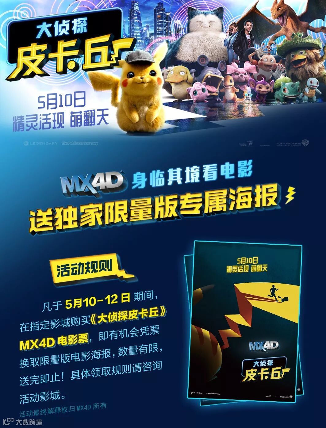 由美国传奇影业、华纳兄弟影片公司联合出品的好莱坞真人电影《大侦探皮卡丘》将在5月10日登陆MX4D,观众可以在动感特效的营造下“进入”神奇的宝可梦世界,与萌到跺脚的大侦探皮卡丘及男主蒂姆携手在莱姆市突破重重困难,揭露真相。