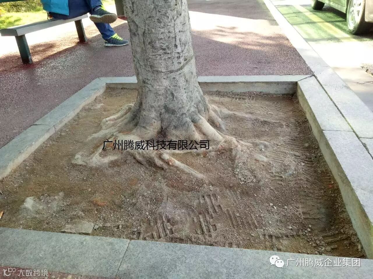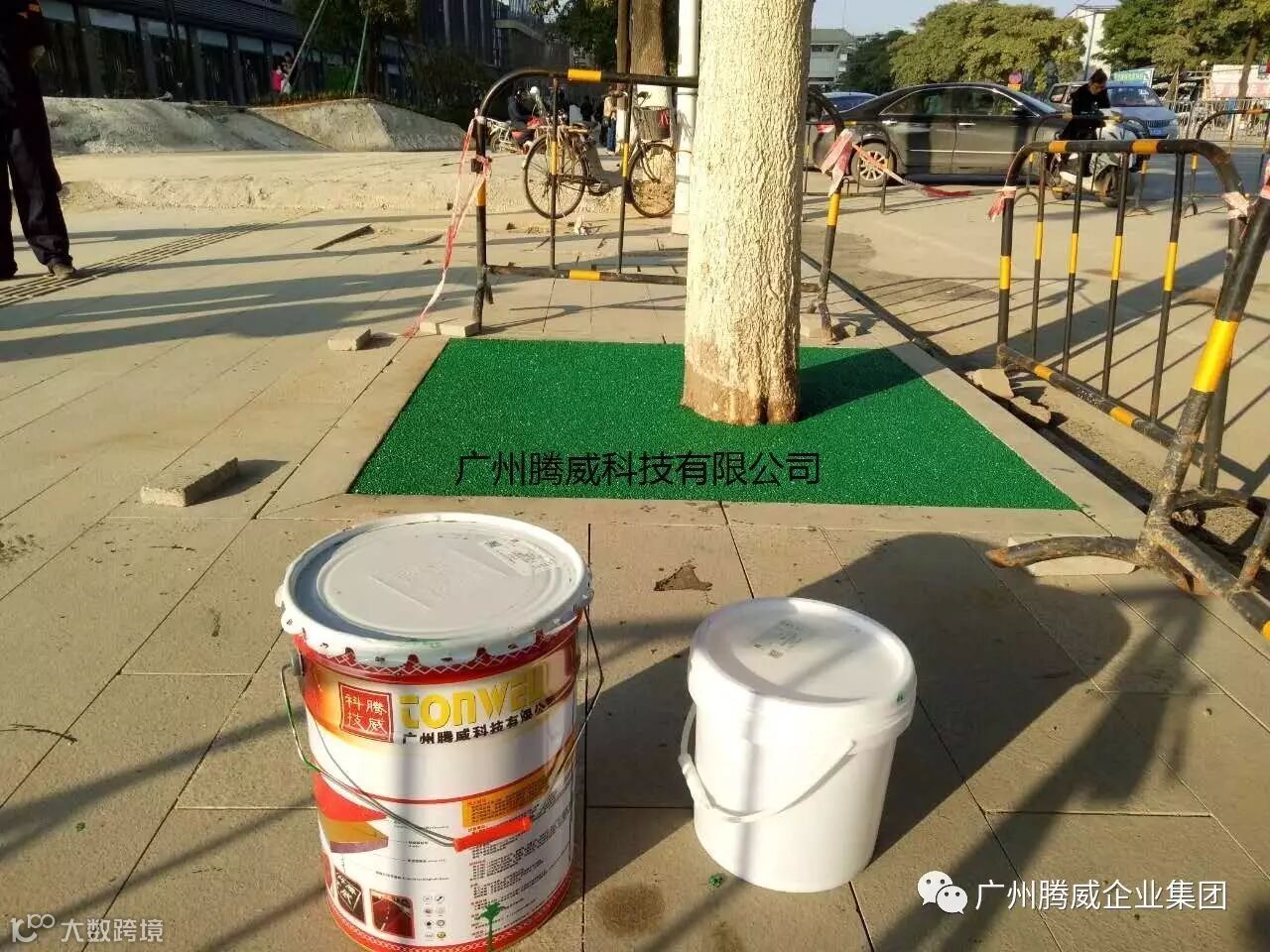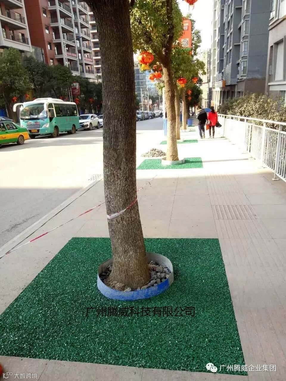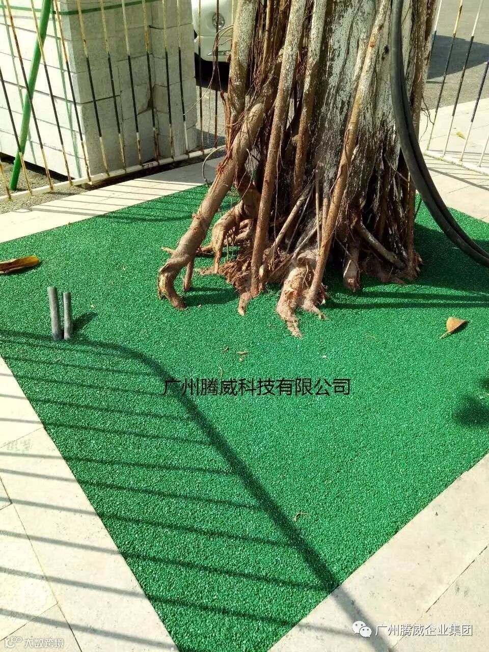 广州腾威科技股份有限公司推出的高端彩色胶粘石生态透水树池系统使用环保的有机复合树脂,经骨料拌合,直接铺装,迅速固化,所铺即所得!固化后得到的透水地面平整光滑、高强度、有韧性,透水率高,相对密度约2.0, 空隙率>25%, 透水系数>0.3mm/秒(透水大于1吨水/小时.平方米),抗压强>25MPa, 抗折强度>4.0MPa。耐候性好,长期不变色、不开裂、无VOC排放。是针对普通混凝土透水铺装材料的革命性改进,不但保留了传统混凝土透水铺装的优点,更突破了其养护期长、容易返碱、褪色、开裂的缺陷,为城市道路的长期美化创造了可能。