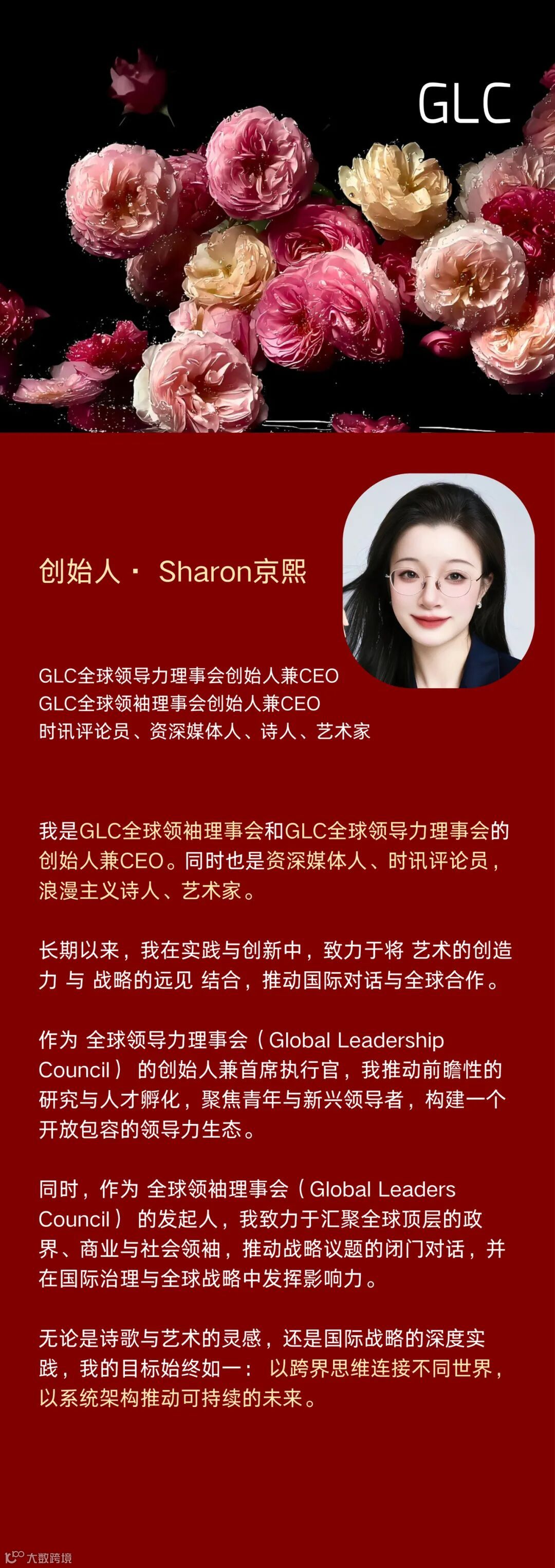 我是GLC全球领袖理事会和GLC全球领导力理事会的创始人兼CEO。同时也是资深媒体人、时讯评论员,浪漫主义诗人、艺术家。