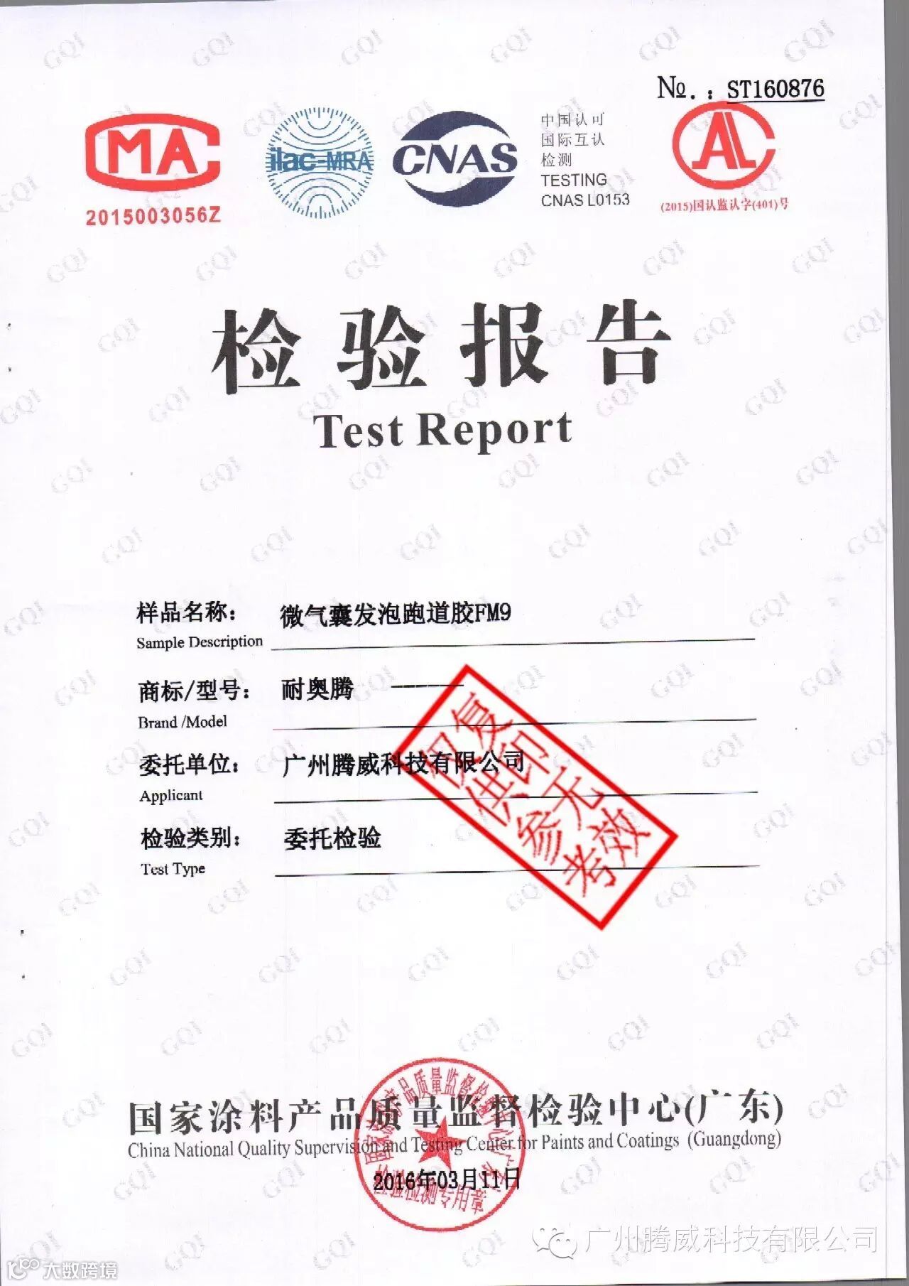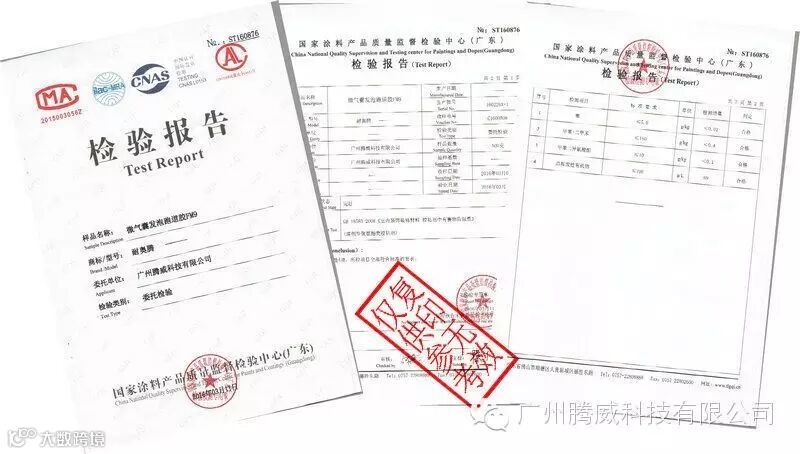 2016年2月我司对产品进行了一次例行抽检,按照国家标准GB18583-2008《室内装饰装修材料-胶粘剂中有害物质限量》随机抽取了2015年11月到2016年2月份生产的发泡跑道弹性料、跑道胶水、硅PU弹性料等产品送国家涂料产品质量监督检验中心进行检测,公司送检样品全部合格,公司的产品质量再一次被肯定!我司会一直坚持我们严格的品质目标,为广大客户提供优质放心的产品!广州腾威科技有限公司是你值得信赖的合作伙伴!