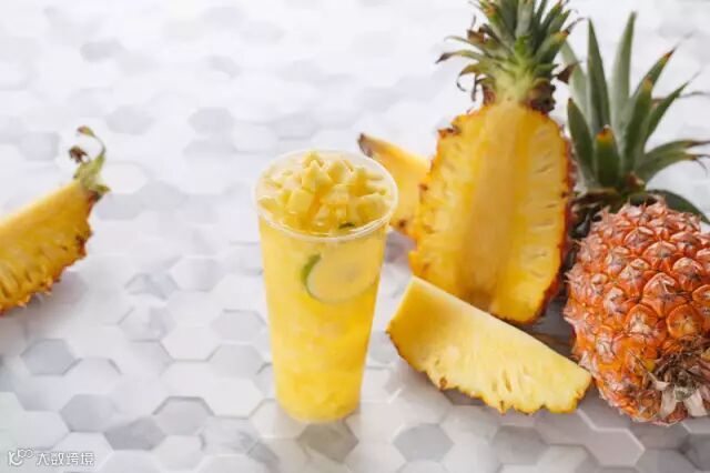 除此外,凤梨含有一种叫“凤梨朊酶”的物质,能分解蛋白质,其所含糖、盐类和酶有利尿作用,适当食用对肾炎,高血压病患者有益。这样一款清甜健康的水果,手工榨取果汁并保留果肉,再配以清新的茶底,一抹明黄,一抹清爽。